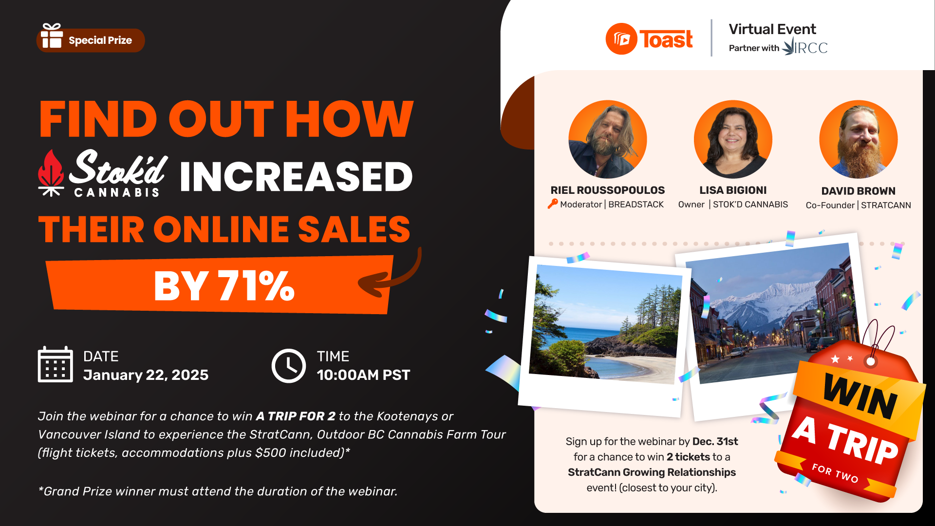 IRCC members who join our webinar can get a chance to win a trip for 2 to beautiful British Columbia (Vancouver Island or the Kootenays) to experience an Outdoor BC Cannabis Farm Tour in September, 2025.